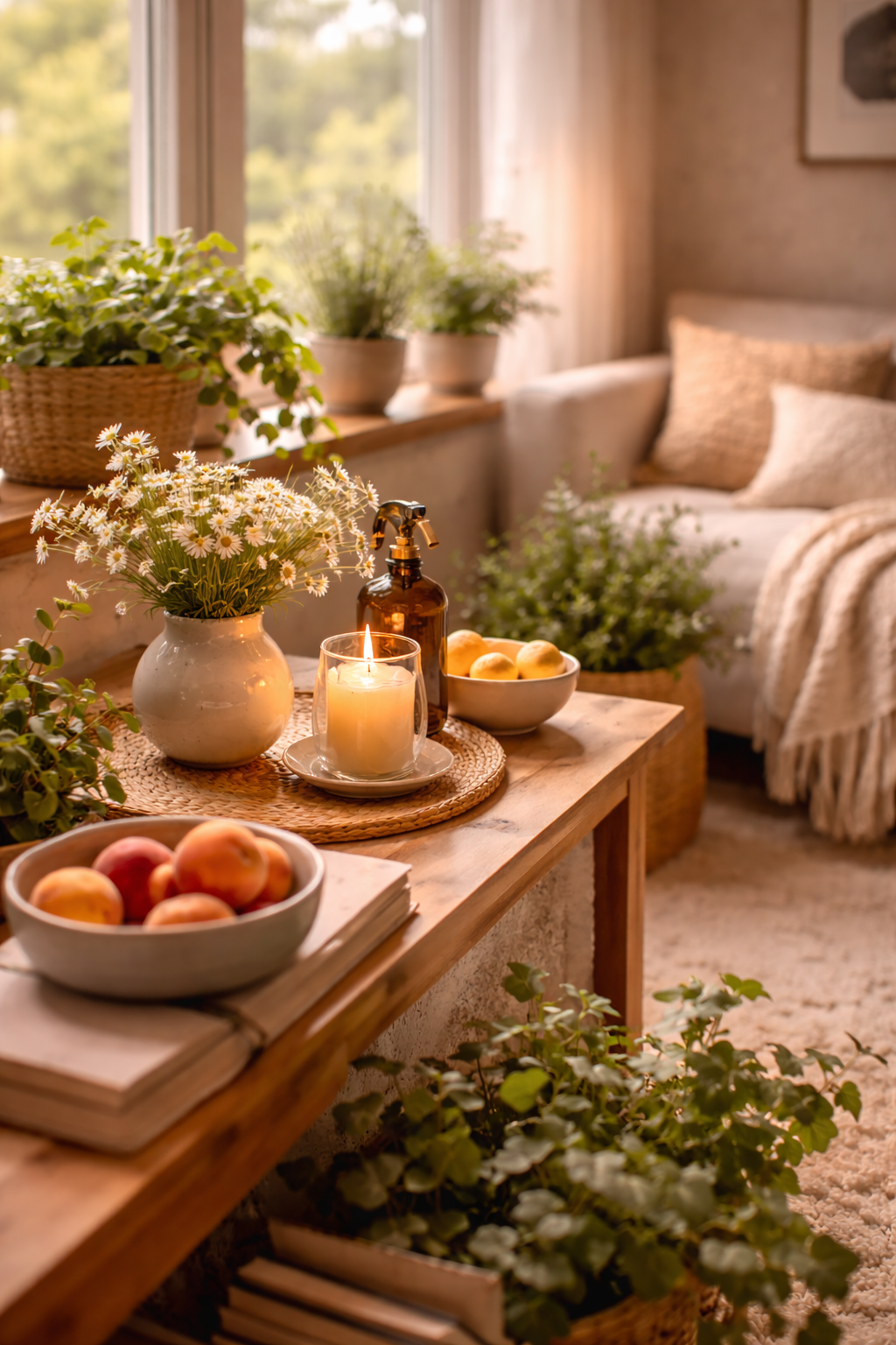 Dekorasi kecil yang dipilih dengan sederhana sering cukup untuk menciptakan suasana meja kerja yang lebih menyenangkan.
